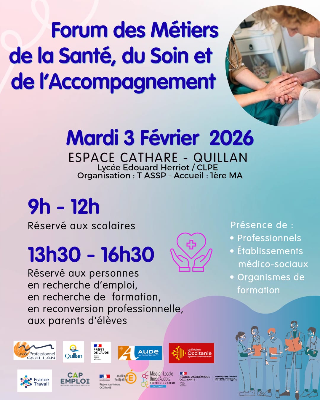 La 2ème édition du forum des métiers de la santé, du soin et de l'accompagnement organisé par le lycée de Quillan se tiendra le MARDI 3 FÉVRIER.