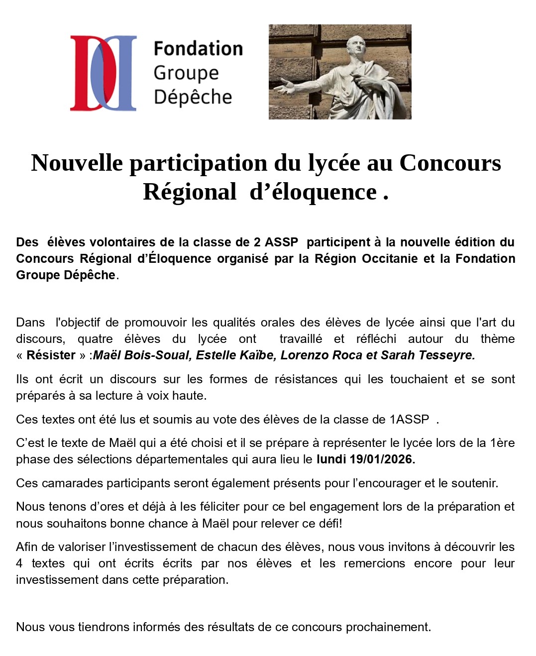 Nouvelle participation du lycée au concours régional d'éloquence